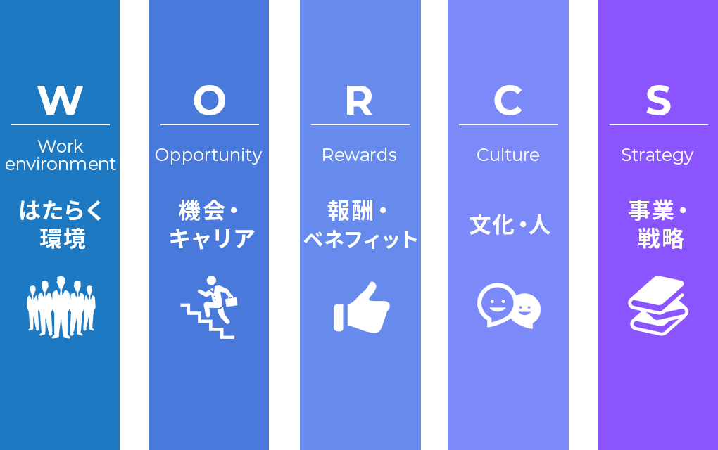 また、各部門と連携しながらインタビューや外部調査を行い採用課題を深掘りします。独自のEVP(※)フレームワークWORCSを用いて貴社の正しい価値を言語化し、採用競合との差別化を行い候補者のアトラクトや面接設計を実施します。- EVPとは「Employee Value Proposition(従業員価値提案)」の略語。企業が従業員に提供できる価値を指します。