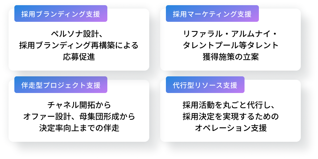 採用マーケティング戦術の実行や採用実務の代行まで貴社専門のプロジェクトチームを組成し支援を可能にしています。 -