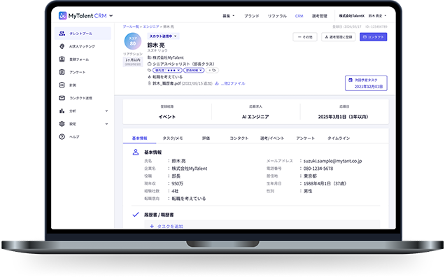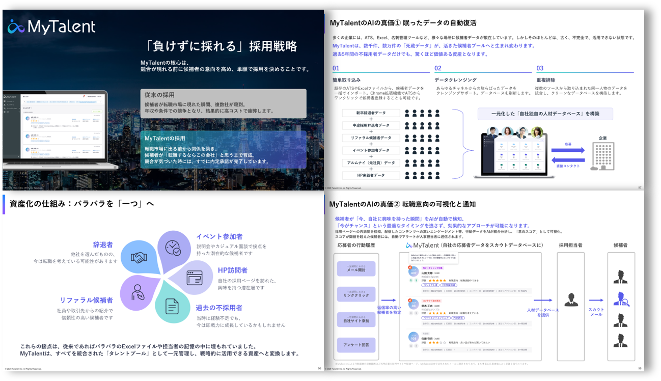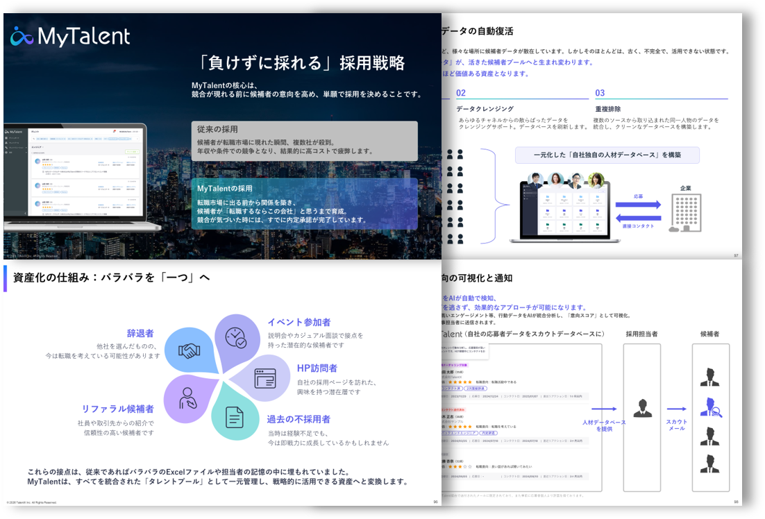 MyTalent CRMは、過去の応募者や潜在層をタレントプール化し、AIが自動で最適な候補者をレコメンドする、AIネイティブな採用CRMです。エージェントに頼らず、自社の資産(データ)で採用を完結し、獲得プロセスの自動化により、人事は体験設計に集中できます。