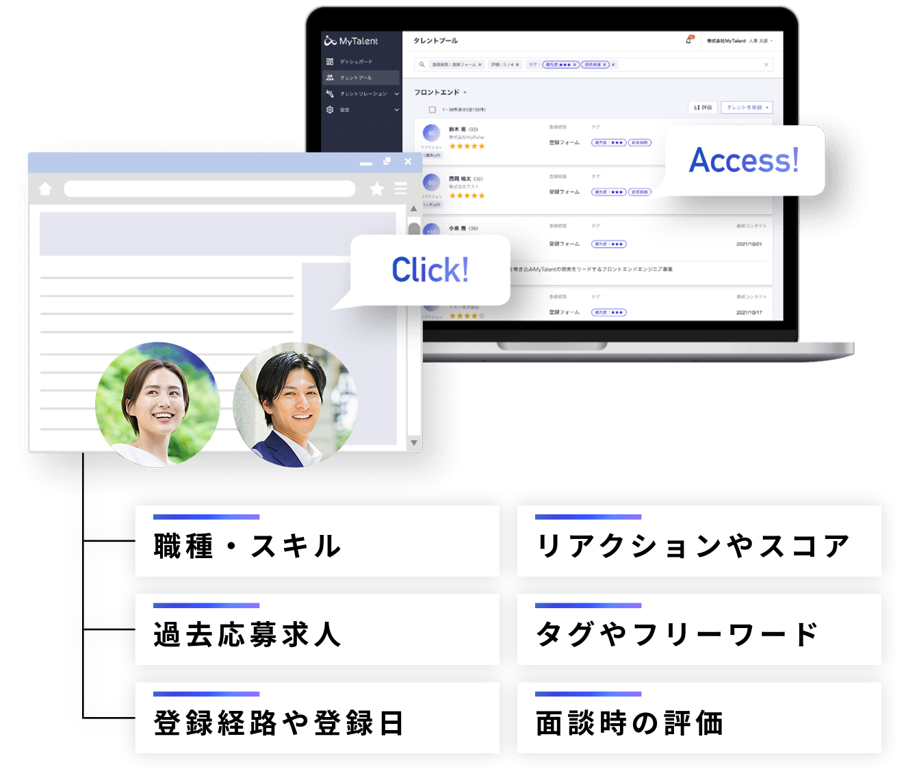 求職者、潜在的求職者のタレントプール構築から、半自動でのアプローチ、持続可能な仕組化までを一気通貫で実現します。