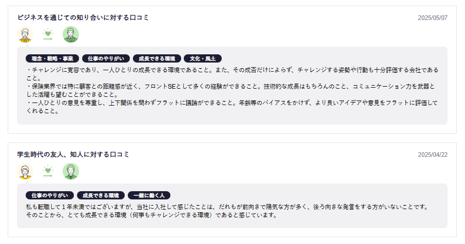 「MyRefer」の推薦コメントを通じて、実際に働いてみないと分からない働きやすさや職場の雰囲気、そしてプロジェクトなどに携わった価値ややりがいといった、求人票の文章だけでは伝わらない”生の声”が多く寄せられています。 また、口コミは社員が「MyRefer」の推薦コメントで投稿した内容をほぼそのまま掲載しています。良い点もそうでない点も含めて、ありのままの情報を伝えることが、結果として入社後のミスマッチを防げるのではないかと思います。