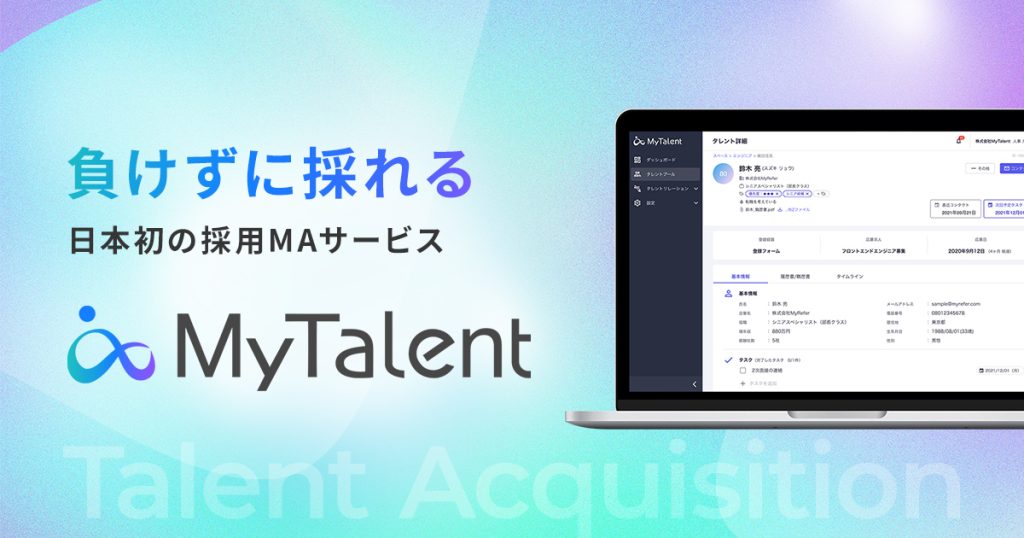 「MyTalent」は“つながり”を資産に変え、採用活動を掛け捨て型から積立型にシフトする日本初のAI採用MAサービスです。過去の採用候補者で当時はご縁がなかった方や、社員紹介での候補者、退職社員、HPから登録があった方など、あらゆる応募チャネルから形成されるタレントデータを「MyTalent」で一元管理し、タレントプール構築から、半自動でのアプローチ、持続可能な仕組み化までを一気通貫で実現します。