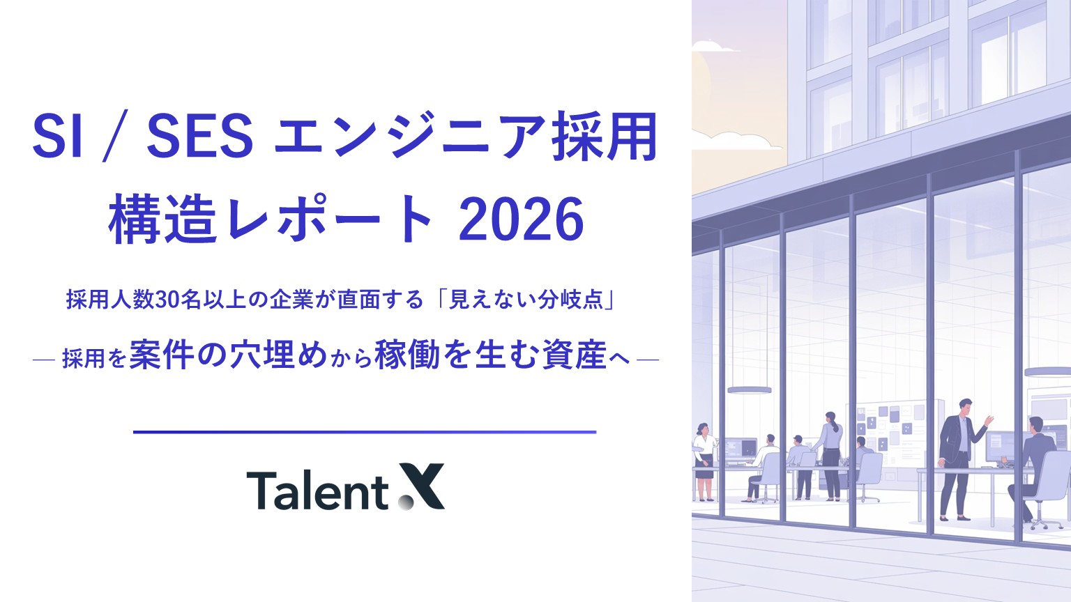 - 本レポートでは、採用が事業成長に直結するSI/SES特有の構造を前提に、採用が積み上がらない背景と、稼働につながる企業の違いを整理しています。エンジニアとの接点を資産として活かし、継続的に稼働を生み出すために、どこで滞留が起きやすく、どこを押さえるべきなのかをまとめています。