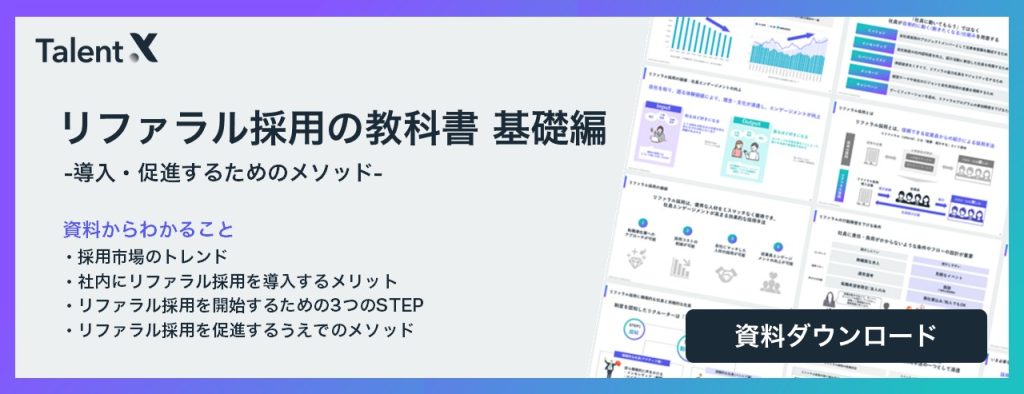 またコープさっぽろ様も力を入れているリファラル採用について、施策の意義・メリット・進め方のポイント等をまとめた資料「リファラル採用の教科書」もご用意しております。ご興味をお持ちの方はお気軽にご覧ください。