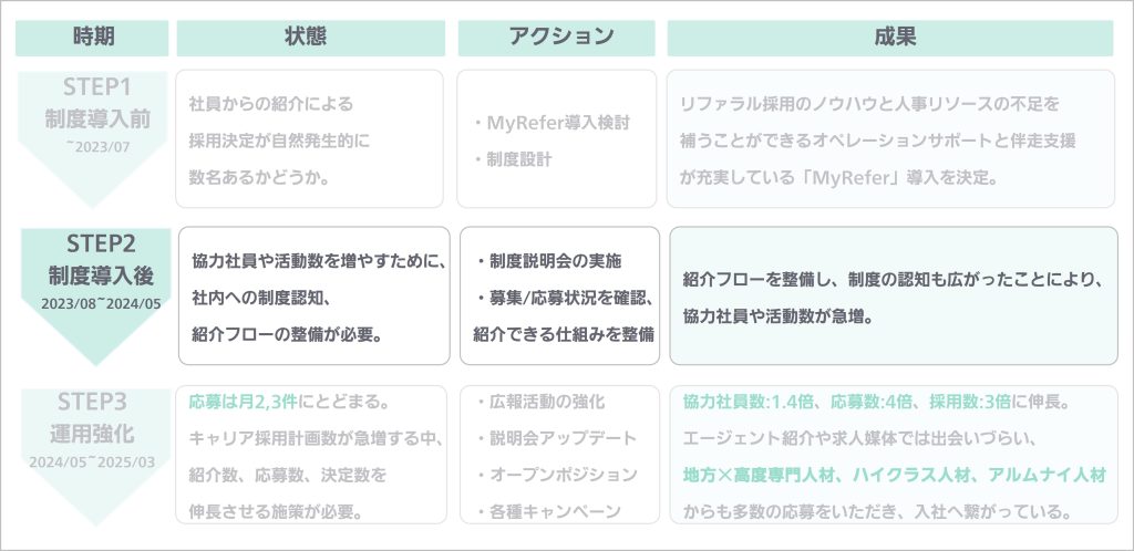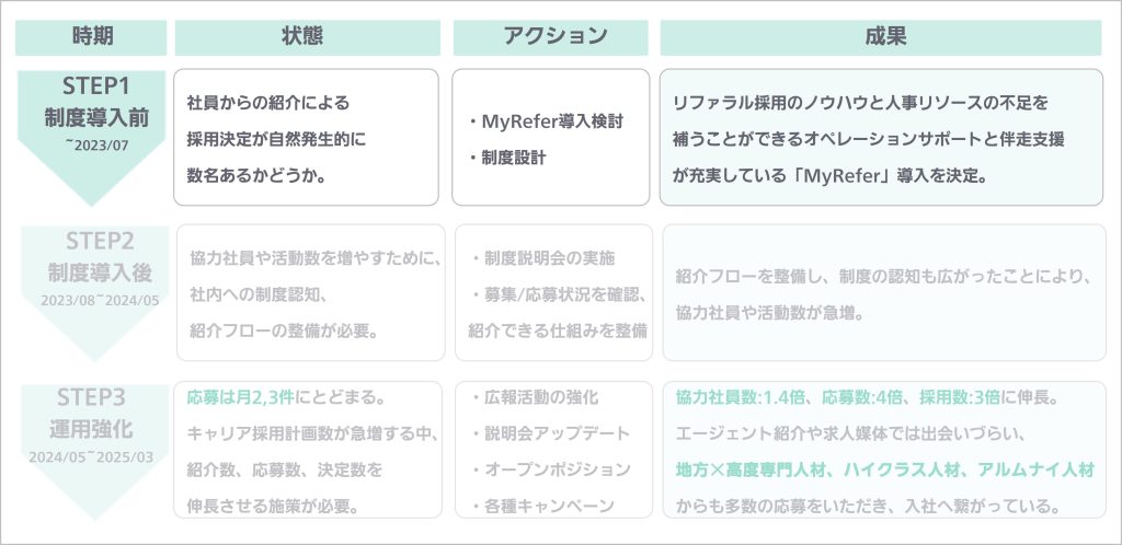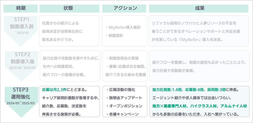 ありがとうございます。当社のリファラル採用の制度導入前をステップ1、制度導入後をステップ2、運用強化時をステップ3としてお話しできればと思います。それぞれのステップにおいて、解決すべき問題があり、都度解決に向けたアクションを実施することで成果に繋げてきました。