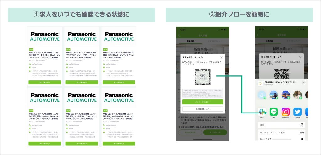 まず、最新の募集状況を確認・紹介できる仕組みを整備しました。どのエリアに、どんな求人の募集がでていて、どのような要件なのかという部分がいつでも簡単に確認ができ、社員が数タップで友人に共有できるといった簡易な紹介フローを整備しました。