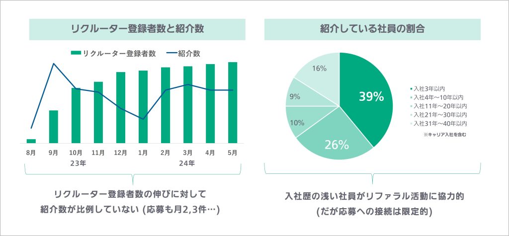 社員が簡単に求人確認や紹介ができる仕組みづくりと、リファラル制度の説明会を複数回実施することで、リファラル採用に協力いただける社員の数は右肩上がりに増えていきました。リファラル採用への協力社員が増加し続ける中でも、TalentXさんと常にリファラル状況をさまざまな視点から可視化し、分析をしていました。分析することで、リファラル協力社員数の伸びに対して、紹介数が比例していないという問題点や、入社歴の浅い社員の方がより活動に協力的であるという事実が見えてきました。このように、リファラル採用の各工程を可視化することで明確になった事実をもとに、次の一手を探していきました。