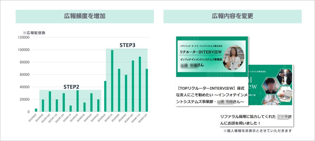 社員にとってリファラル採用の存在は忘れがちになってしまうものだと思いますので、多角的かつ定期的な情報発信を行うことで、社員にリファラル採用制度を思い出していただく機会を増やせればと考え、社内広報を強化いたしました。運用を強化したステップ3では、制度導入後のステップ2と比較して約3倍の頻度で広報を実施しました。また広報の内容についても、閲覧数等のデータも参考にしながら、社員インタビューなど、より社員の興味関心を惹きやすいコンテンツに注力いたしました。