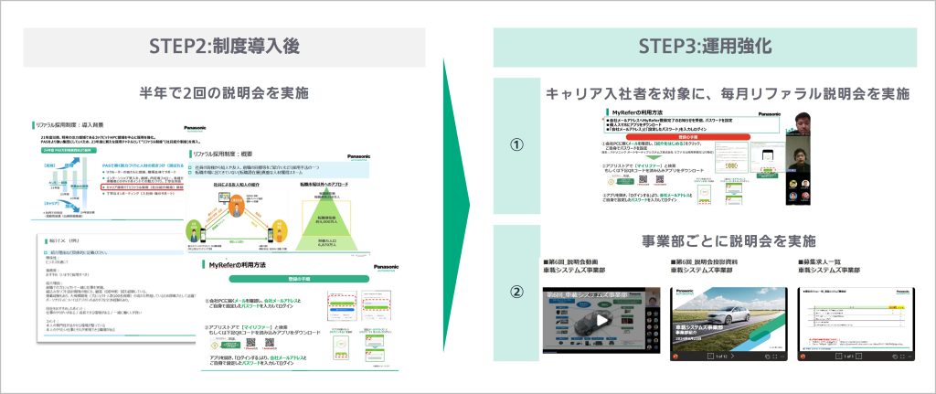 次にステップ2の制度導入後ですが、制度を導入して終わりではなく、ここからリファラルに協力していただける社員を増やす活動をしてまいりました。