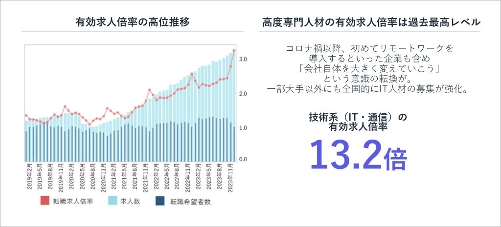 日本の労働人口は減少の一途を辿る中、各社のキャリア採用は加速し、有効求人倍率は3倍を超えています。特にソフトウェア人材などの高度専門人材は、事業の成長や拡大を担う人材として重要視されており、有効求人倍率も13倍を超え、従来の採用手法では接点を持つことさえ難しくなっています。