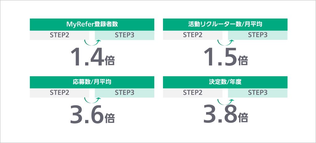 こうした様々な施策を実施した結果、リファラルに協力していただける社員数が増加し、リファラル採用そのものが活性化したことはもちろんのこと、紹介の質が向上したことで応募数が伸長し、採用決定数もステップ2と比較すると3.8倍にまで伸ばすことができました。
