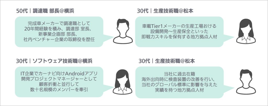 リファラル採用での決定者のペルソナについても一部ご紹介できればと思います。例えば調達部門の部長ポジションや、長野県松本市などの地方拠点、かつ高い専門性が必要なポジション等、従来の採用手法では接点を持つことすら難しいハイクラスの人材の獲得に繋がりました。
