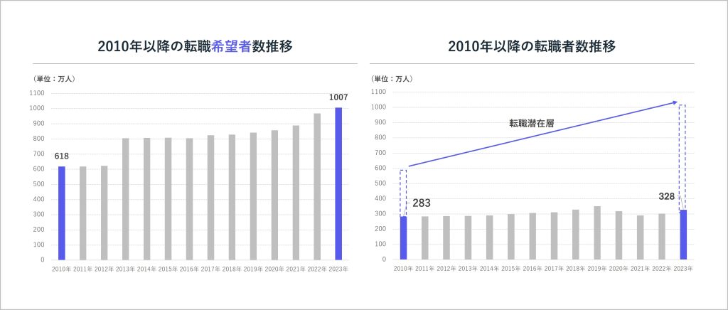 そんな人材獲得競争が激化する中、転職潜在層というキーワードに注目が集まっています。まず右側の図をご覧いただければと思いますが、2010年以降実際の転職者はほぼ横ばいの状況ながら、転職を希望している方々に関しては、2010年618万人であったところから、2023年には1000万人を超えました。この「転職をしたいものの、実際には動けていない≒転職潜在層」の方々をいかに採用に結び付けるかが採用のカギになっています。