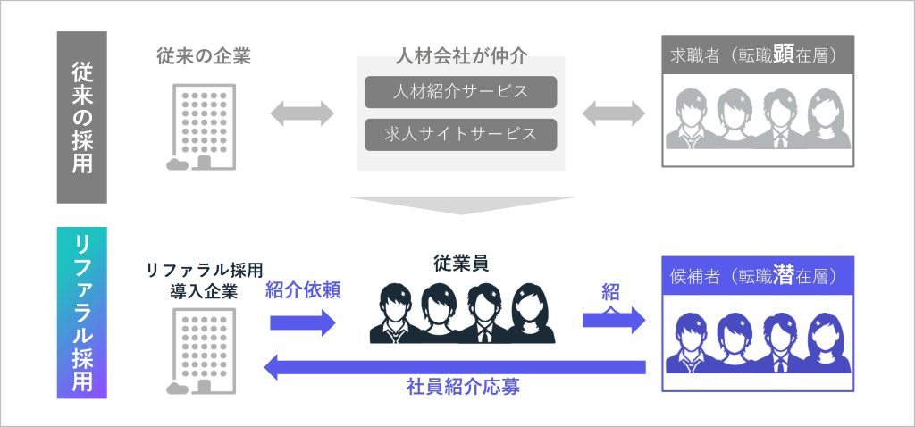 転職潜在層が増加する背景から、従来の採用手法は実施しつつ、転職潜在層にアプローチできる採用手法に注力する企業様が増加しています。転職潜在層にアプローチできる採用手法の中でも、今回はリファラル採用についてお話しできればと思っております。改めてにはなりますが、リファラル採用とは信頼できる従業員からの紹介による採用手法を指します。転職潜在層から単願応募の獲得やミスマッチの低減、採用コストの削減など、多方面にメリットのある採用手法として、促進を強化する企業が増加しています。