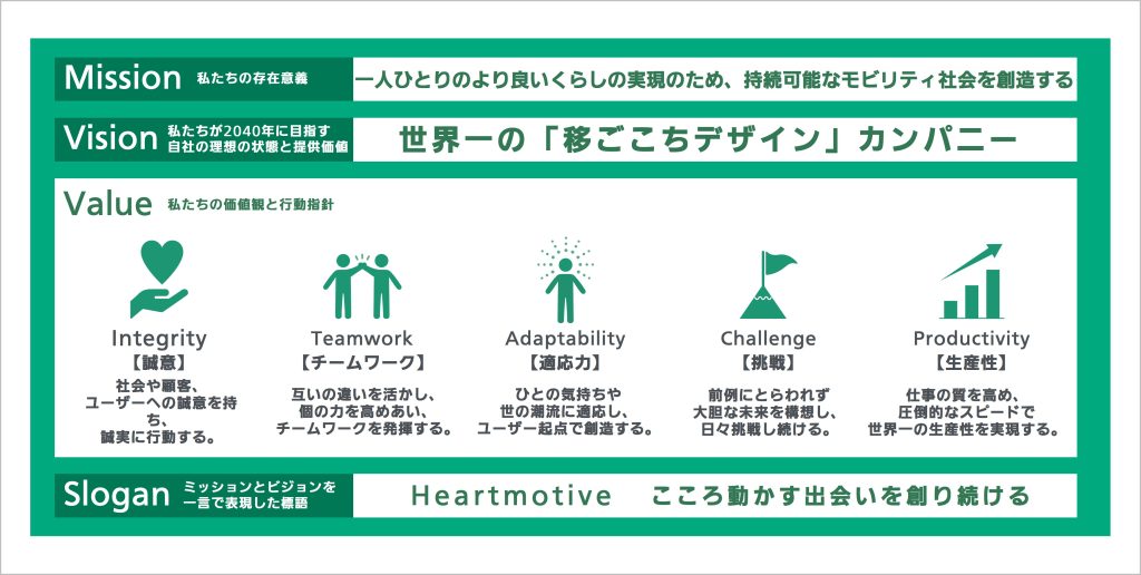 そんな私たちの存在意義、ミッションは、一人ひとりのより良いくらしの実現のため、持続可能なモビリティ社会を創造することです。このミッション実現のために、世界一の「移ごこちデザイン」カンパニーというビジョンを掲げています。空間の居心地や服の着心地、あるいは寝具の寝心地のように、移動にも心地よさを感じていただきたいという想いで移動の”移”という漢字を用いて、「移ごこち」といたしました。「移ごこち」が良くなれば、移動はもっと活発になる。移動が増えれば、心動かす出会いがもっと溢れる世の中になる。そのために安心安全はもちろんのこと、快適で環境にも配慮した「移ごこち」をデザインしていきます。