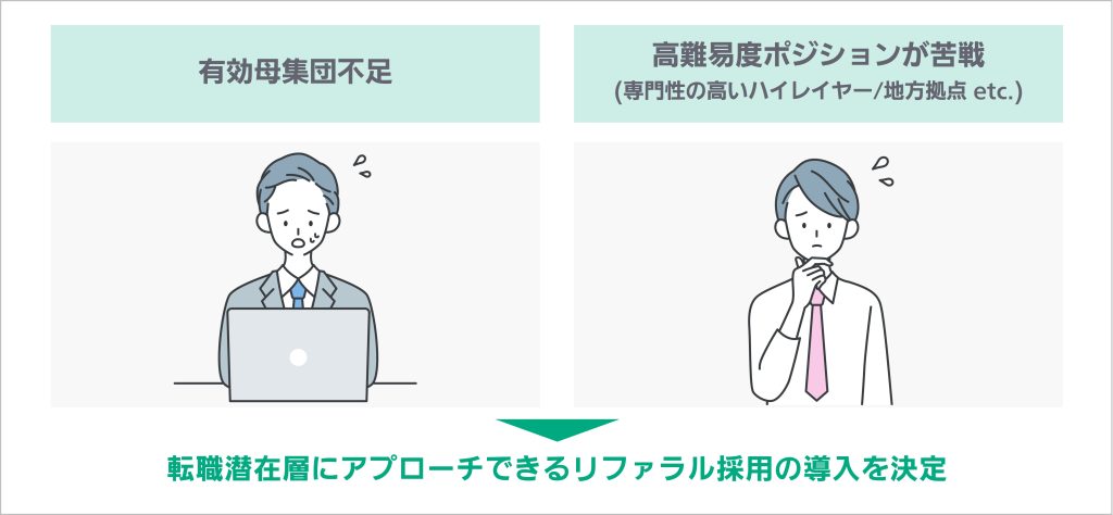 そうですね、キャリア採用を強化していく中で様々な採用課題が顕在化しました。特に有効な母集団不足、高難易度ポジションへの課題が顕著となりました。これまでの採用方法では採用目標を充足させ続けることが難しいと考えまして、過去にアプローチが出来ていなかった転職潜在層にアプローチできる、リファラル採用の導入を決定いたしました。