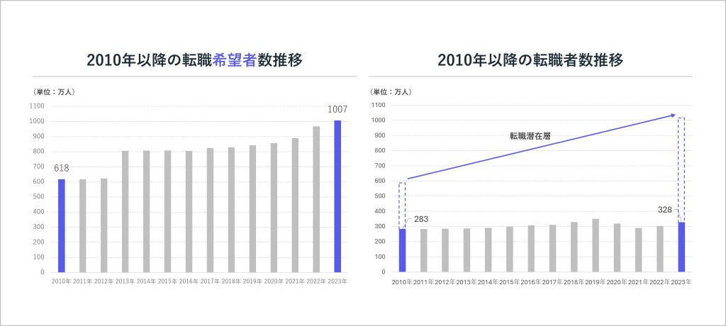転職潜在層へのアプローチは金融業界に関わらず近年注目されています。人材紹介や求人媒体を活用し、積極的に転職活動を行う”転職顕在層”の方々は10年間人数が横ばいである一方、転職を希望するものの、実際には動き出せていない”転職潜在層”の方々は、2010年は618万人であったところから、2023年には1,007万人にまで増加しています。この増え続ける転職潜在層の方々を採用に結び付けられるかが採用成功の鍵とされており、企業は転職顕在層を対象とした既存の採用手法から、転職潜在層にアプローチできる新たな採用手法への変革が必要となっています。