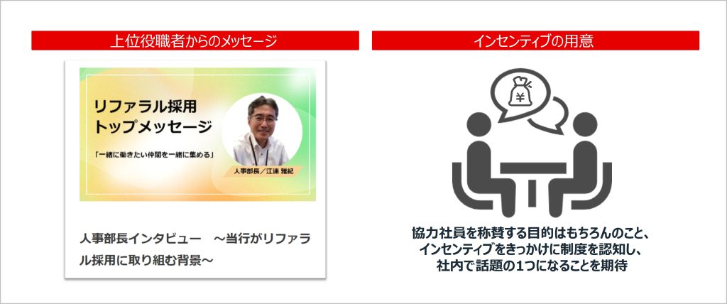 加えて、トップマネジメントからのリファラル採用への期待値についても行員にお伝えできるよう、人事部長のインタビューを配信したり、インセンティブを設定したりという活動も実施しています。