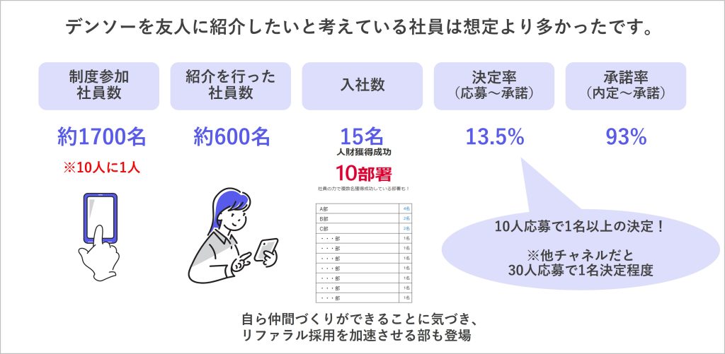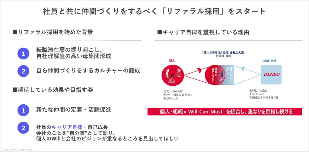 1つ目は、転職潜在層へのアプローチです。ビジョンを実現していく上で、多様な人財を採用していく必要がありますが、従来の採用方法では限界が生じていました。既存の手法で転職顕在層にアプローチするだけではなく、転職潜在層の方にアプローチしていく上で、デンソーの企業文化や価値観に共感してもらえる人材を採用するためにはリファラル採用が有効だと考えました。