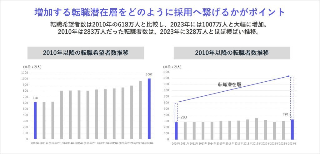 転職希望者数は2010年の618万人から2023年には1,000万人を超えましたが、実際の転職者数は同期間で、283万人からほぼ横ばいである328万人にとどまっています。このギャップが「転職潜在層」の増加を示しており、企業はこれらの転職潜在層をいかに採用に結びつけるかを考える必要性が高まっています。