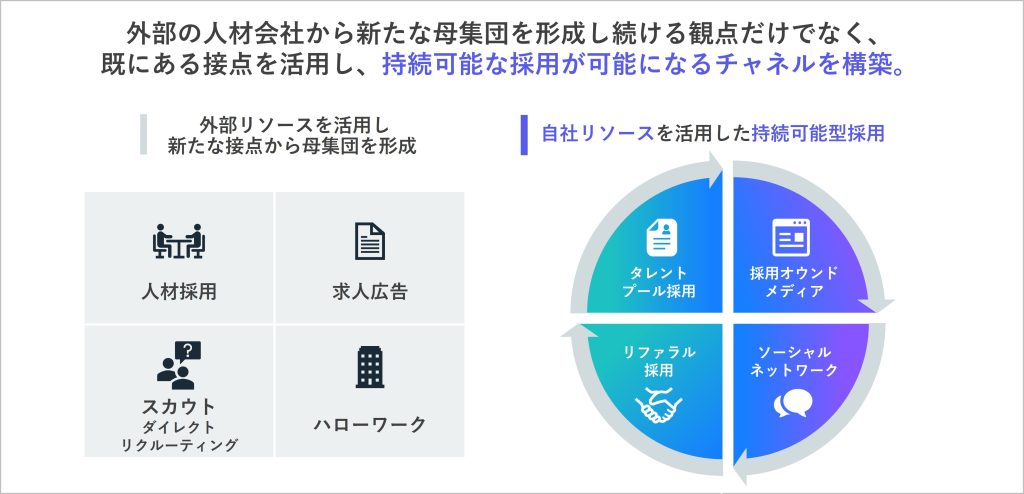 従来の人材紹介や求人広告、ダイレクトリクルーティング、ハローワークといった外部のリソースを活用した採用手法ではなく、企業は自社のオウンドメディアやSNS、リファラル採用、タレントプール採用といった、自社のリソースを活用した「持続可能型の採用」を通じて転職潜在層にアプローチすることが必要になってきています。