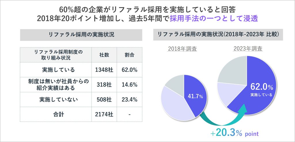 2023年度に当社が実施した調査では、「約6割近い企業様がリファラル採用を実施している」「約7割の企業が、制度化していないものの、実際に社員からの紹介実績がある」といった結果がでています。年々リファラル採用に取り組む企業が増加している中で、当社にご相談いただくお悩みとして、リファラル採用の導入にあたり「制度化の進め方」 「工数懸念」「運用方法」などをいただく機会が非常に多いです。