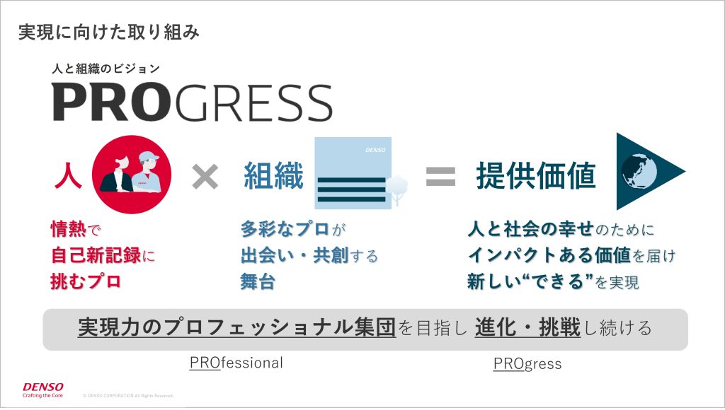デンソーでは人と組織のビジョン「PROGRESS」を掲げ、人事改革に取り組んでいます。「実現力のプロフェッショナル集団」の一員として「一人ひとりが情熱で自己新記録に挑むプロである」ことと、プロが出会い競争する舞台を提供していくことを掛け合わせて、提供価値をさらに大きくしていことを掲げています。