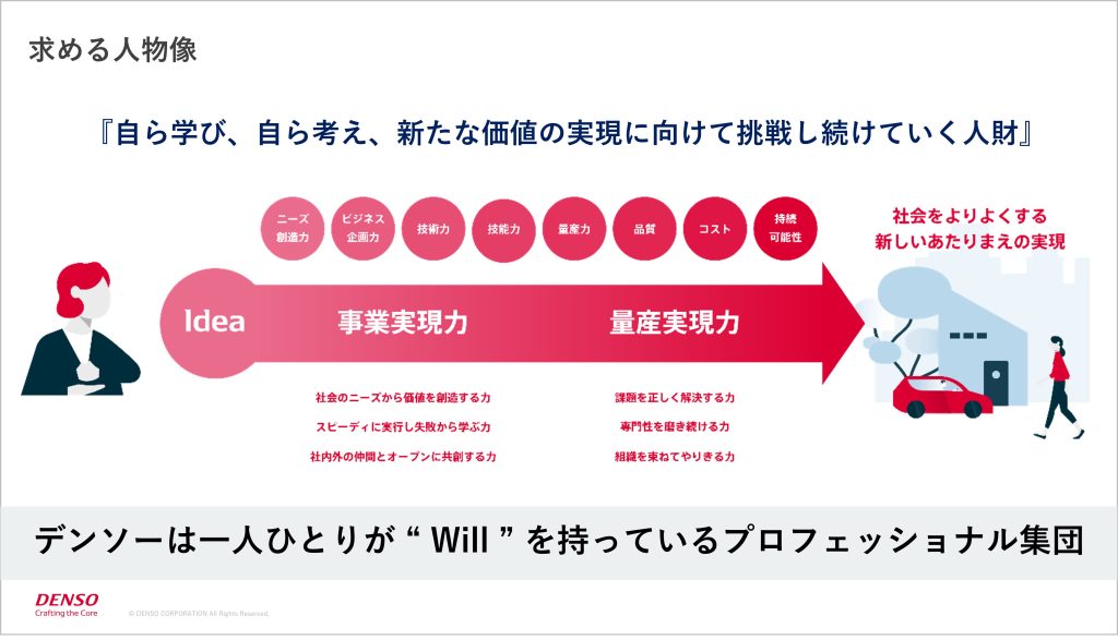 その中で私たちは、「自ら学び、自ら考え、新たな価値の実現に向けて挑戦していく人材」を幅広く求めています。ビジネスを創造する事業実現力から、価値を世界中に届け切る、持続させるという量産実現力まで一貫して、willとプロ意識を持つ集団であり続けたいと考えておりますし、そうした思いに共感いただける方に入社いただきたいと思っております。