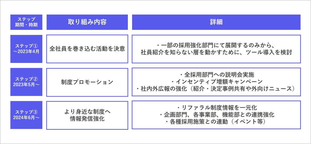 2016年からリファラル採用を制定していたものの、広報活動が形骸化しており、施策として動かしていくことができない状況でした。先ほどお伝えした強化背景から、2023年よりリスタートを掲げ、全社員を巻き込む活動をやっていこうと取り組みを開始しました。当時、リファラル採用制度を知っている人がごく一部になっていました。全社員が自社を紹介できる状態を目指し、リファラル採用制度を知らない大多数の方にまずはいち早く知ってもらい、その上でいつでも簡単に自社を紹介できるよう「MyRefer」ツールの導入を検討し、導入にいたりました。