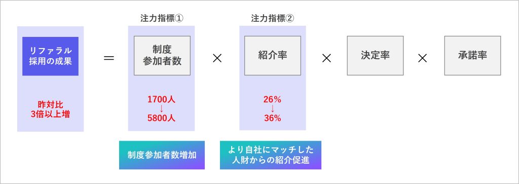 2024年度は、昨対比3倍以上のリファラル採用決定を目指しています。注力指標として、制度参加者数と紹介率を掲げて、各部門と連携しながら活動しています。