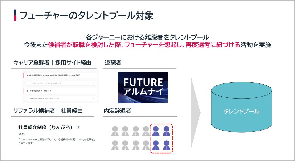 我々の今後の展望としては、フューチャーのファンを増やしながら、タレントプールにより優秀な人材を獲得できる仕組みの構築を進め、重要な採用チャネルとして拡大できるよう取り組んでまいります。