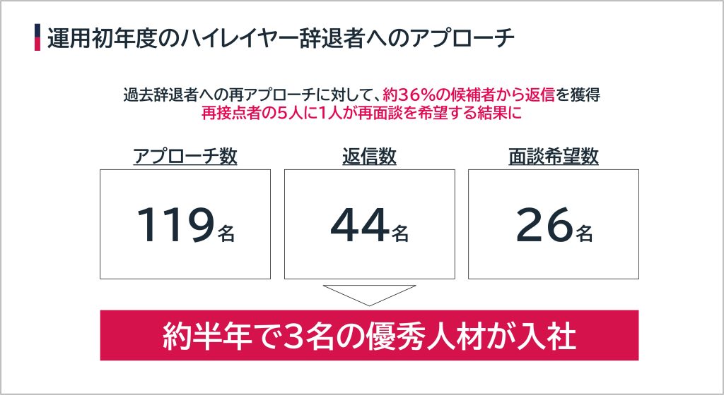 特にハイレイヤー層向けに本取り組みを強化したのですが、結果的には約36%の候補者から返信を獲得することができまして、5人に1人から再面談の希望をいただける結果となりました。その後約半年という期間で、3名の優秀な人材が入社をしてくれる結果に繋がり、とても嬉しく思っております。