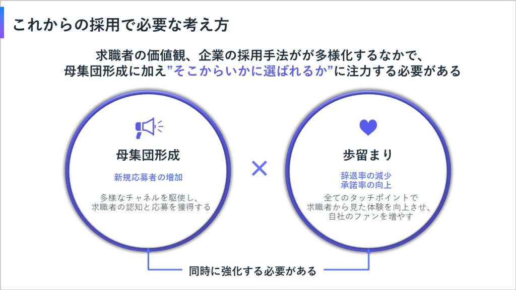 こうしたタレント獲得競争が激しい市場の中では、母集団形成が非常に重要である一方で、候補者に応募いただいてから、しっかりと入社いただくまでの「歩留まり」をいかにして向上できるかという部分が非常に重要になっています。