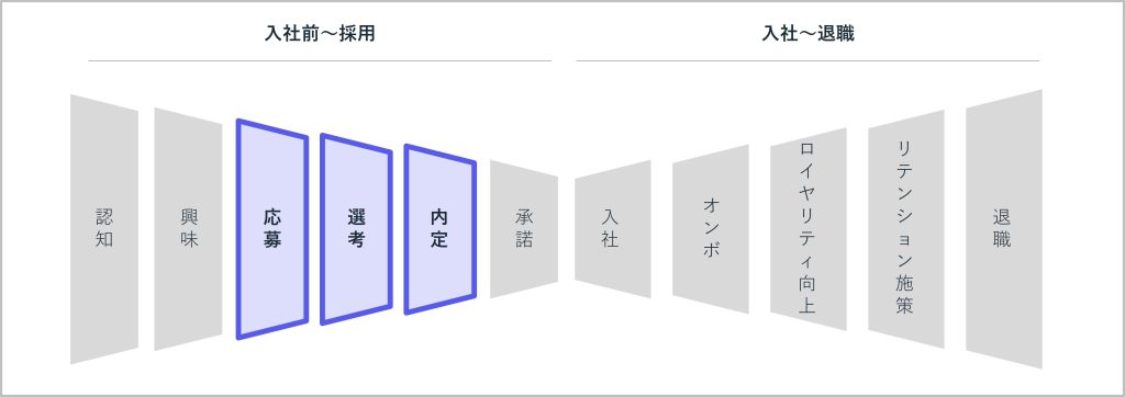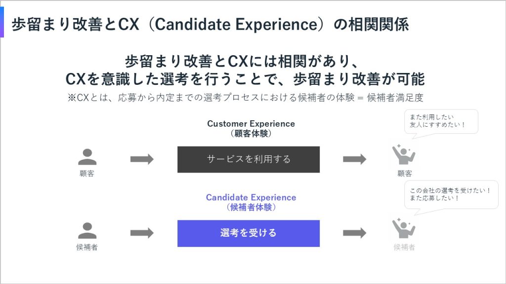 一方で採用の観点では、「キャンディデイトエクスペリエンス」として、採用候補者の選考体験をいかにして向上させるかが、歩留まり改善に大きく影響します。