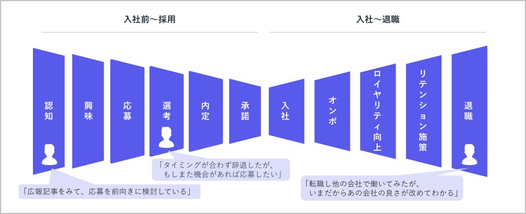 選考過程でどれほど良いことを伝えても、入社してからギャップが発生するとすぐに退職に繋がってしまい、有効なCXとは言えません。認知の過程から自社に魅力を感じてもらい、実際に入社した後も「良い会社だな」と感じながら働いてもらい、次のキャリアにチャレンジする際も自社を好きな状態で退職してもらう、といった一気通貫で良いCXを作っていくことが重要です。