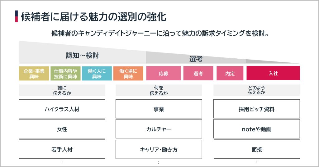 ここからは、自社で取り組むCX向上の具体施策についてご紹介できればと思いますが、応募に至るまでの認知から検討フェーズで行っている内容と、応募してくれた候補者のために行う内容とを分けてお話ししたいと思います。