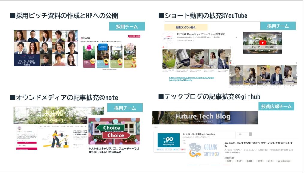 フューチャー株式会社では、2024年の方針として「採用広報」と「ダイレクト採用」の強化を掲げております。その中でも、候補者に届ける自社魅力の選別には力を入れて行っています。具体的には、キャンディデイトジャーニーに沿う形で、情報発信する際に「誰に、何を、どのように伝えるか」を細かく定義しながら、候補者への自社魅力の訴求を行っています。
