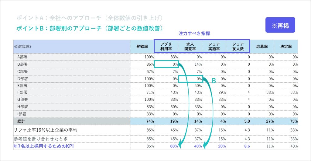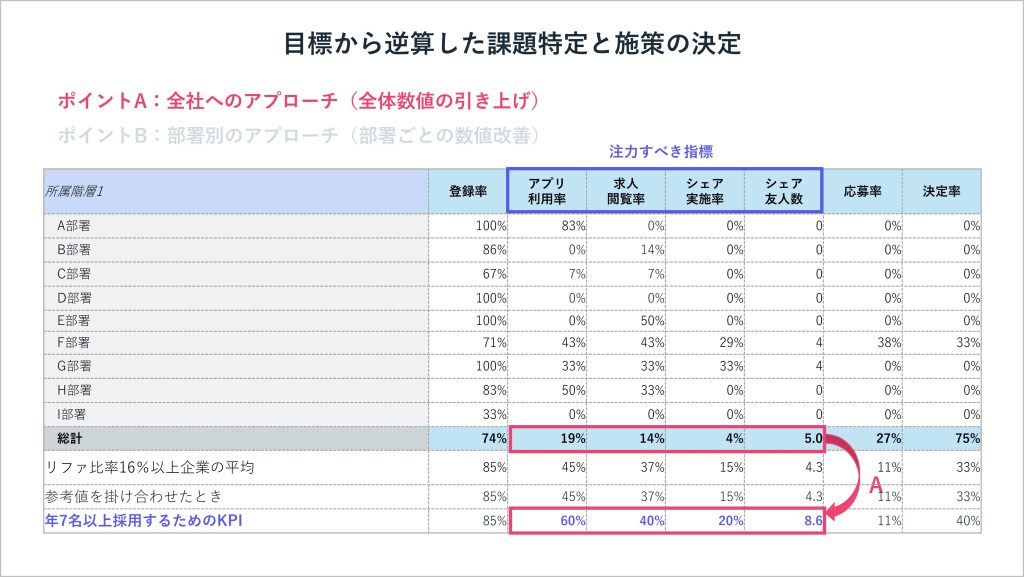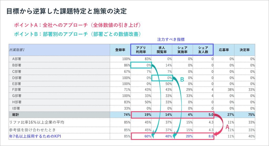 スライドの数字から「A:全体アプローチの底上げ」「B:部署別のアプローチ」が必要なのが見えてきたということですね。