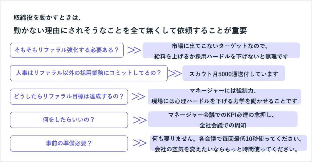 次ページの添付スライド内の、左側がやらない理由だと思っているのですが、取締役が疑問を持った状態かつ、人事が答えられないと、基本的にリソースを割いていただくのは難しいと思います。なので、添付スライド(※下記の画像)内の右側のように回答していくことで、最終的に、「ご依頼したいことは会議で3分ください。カンペ作りますので周知をお願いします。」といったコミュニケーションに着地しました。