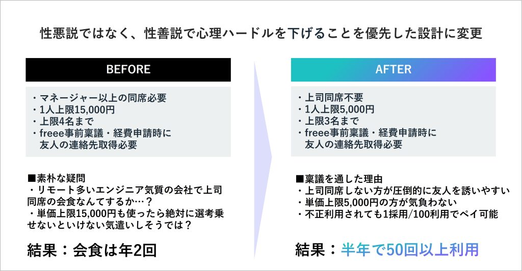 上司が同席必須だった理由は、皆さんのご想像通りかと思いますが、不正利用を防ぐ観点から設計されていました。しかし、会食は友人のエントリーを約束するものではありませんし、エントリーされなかったとしても不正かどうかは分かりません。コスパ観点だと、エージェントと比較すれば100回ぐらい会食制度をご利用いただいても、会食きっかけに1人決まれば採算がとれる計算になります。それぐらいコスパがよいものなので、必要以上に何か縛って、プレッシャーを与える必要はなく、性善説で実施したほうがいいと考えました。