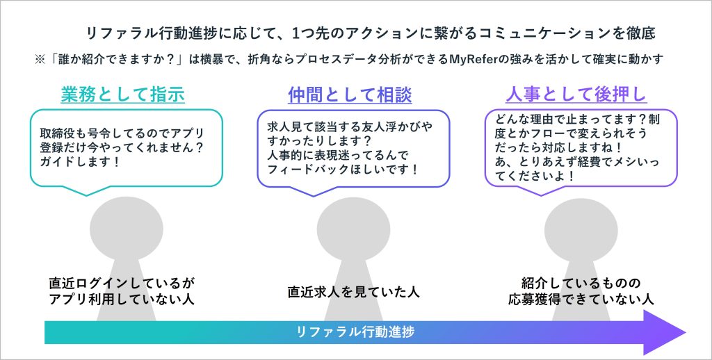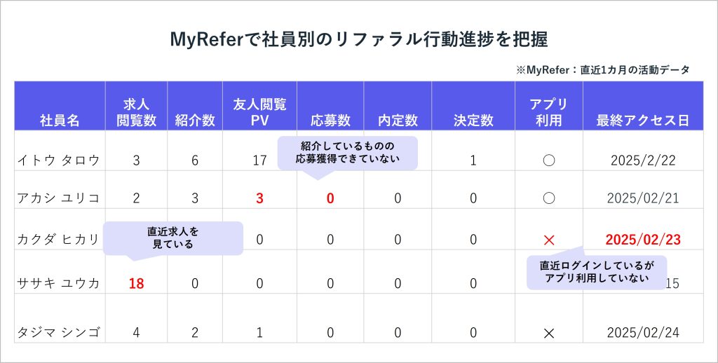 前提、特別注力した施策ではないので参考程度までに聞いてもらえたらと思うのですが、リモートが多い会社なので、出社してる人は多くありません。出社社員に対して、「リファラルどうですか」と言いたい気持ちはありますが、基本怖がられてしまします。なので、MyRefer上でお名前を検索して、その方がどこまで進捗しているか把握した上で話しかけてました。