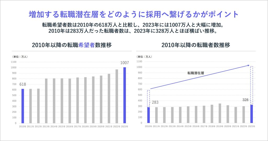 転職希望者数は2010年の618万人から2023年には1,000万人を超えましたが、実際の転職者数は同期間で、283万人からほぼ横ばいである328万人にとどまっています。このギャップが「転職潜在層」の増加を示しており、企業はこれらの転職潜在層をいかに採用に結びつけるかを考える必要性が高まっています。