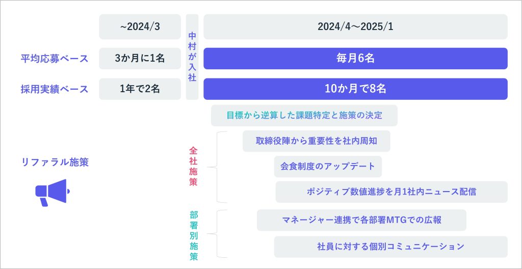 時系列に「中村が入社」とありますが、私が入社する前は、1人の社員の頑張りで数字が上がっていた状況でした。成果からお伝えすると、中村の入社後は、毎月6名ペースで新しいご友人の連絡先を獲得できており、2024/4からだと10か月で8名の方が入社決定しています。うまくいけば来週、再来週でプラス2名決定が生まれそうなので、10名決定が見えているような状況です。全社施策と部署別施策に分けて、まずは全社施策を優先順位高く実施し、様子を見ながら部署別の施策も推進してきました。