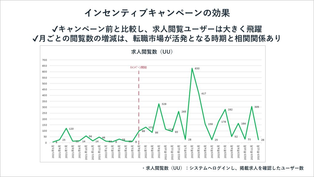 インセンティブ導入の目的の1つに、社員のリテンション向上を掲げていました。下記のグラフは求人閲覧数の増減を表しています。赤い点線の箇所がキャンペーンを打ち始めたタイミングですが、キャンペーンを通して、実際に社員の求人閲覧数が右肩上がりで伸びています。