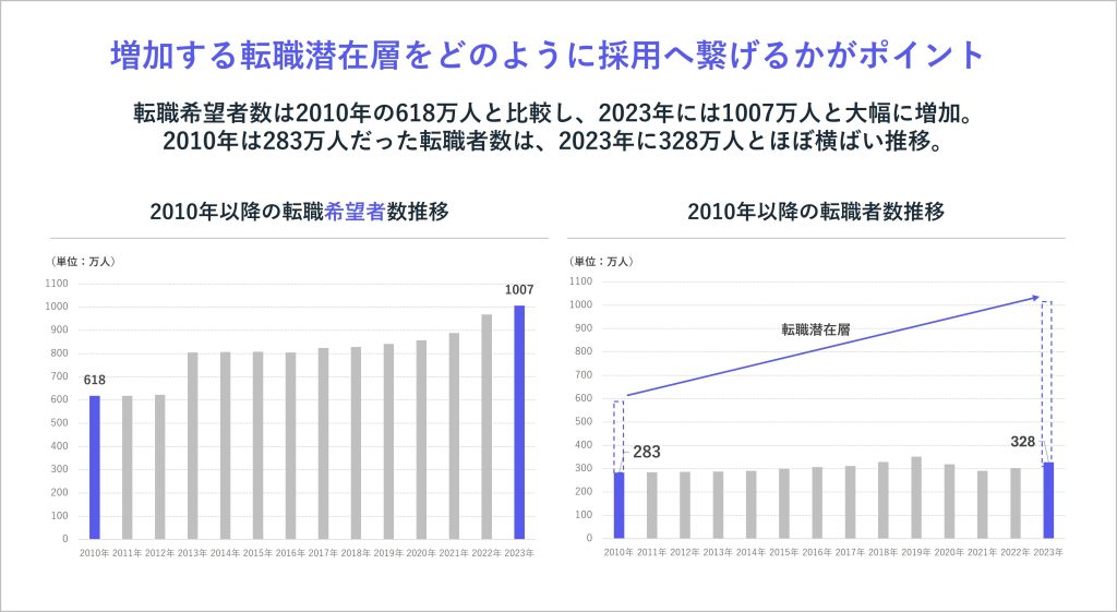 転職希望者数は2010年の618万人から2023年には1,000万人を超えましたが、実際の転職者数は同期間で、283万人からほぼ横ばいである328万人にとどまっています。このギャップが「転職潜在層」の増加を示しており、企業はこれらの転職潜在層をいかに採用に結びつけるかを考える必要性が高まっています。