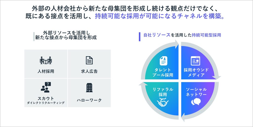 従来の人材紹介や求人広告、ダイレクトリクルーティング、ハローワークといった外部のリソースを活用した採用手法ではなく、企業は自社のオウンドメディアやSNS、リファラル採用、タレントプール採用といった、自社のリソースを活用した「持続可能型の採用」を通じて転職潜在層にアプローチすることが必要になってきています。