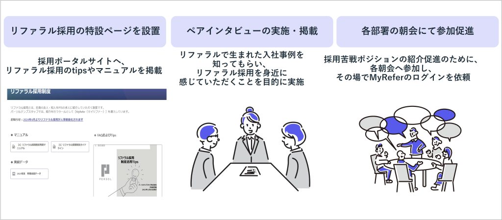 まずはリファラル採用という手法を社員の皆さんに知っていただこうと思い、社内のイントラサイトにお知らせを掲載したり、チラシを配布したりと周知活動を行っていました。また、中途入社したばかりの方は社外の方とのコンタクト頻度も多いのでは?と仮説を立てまして、入社日のガイダンスにMyRefer並びに社員紹介制度の仕組みについてお伝えしたり、採用苦戦ポジションの紹介促進のために朝会に参加するなど、個別アプローチも実施しています。
