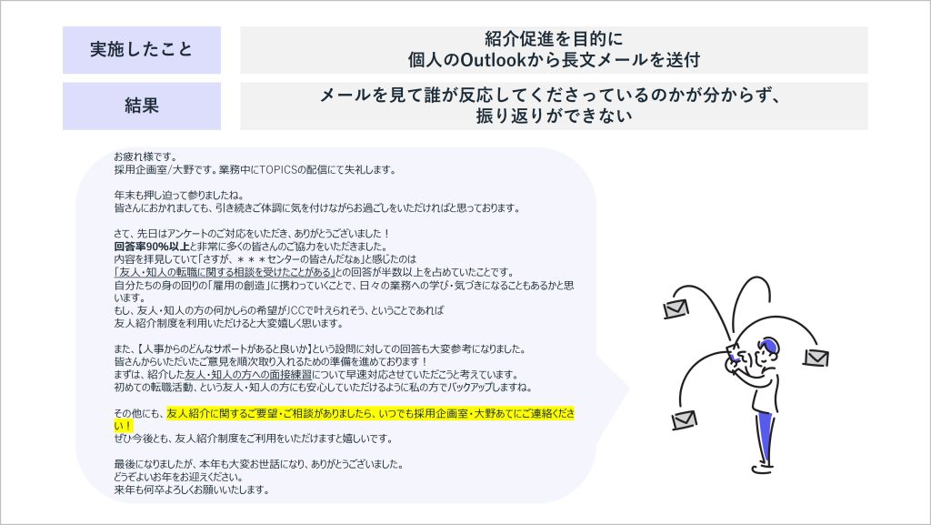 リファラル採用の専任担当として取り組み始めて2年ほど経過した際に、とにかく会社の皆さんにリファラル採用を知ってもらいたいと思い、人事からリファラル採用に関するお知らせメールをお送りしました。