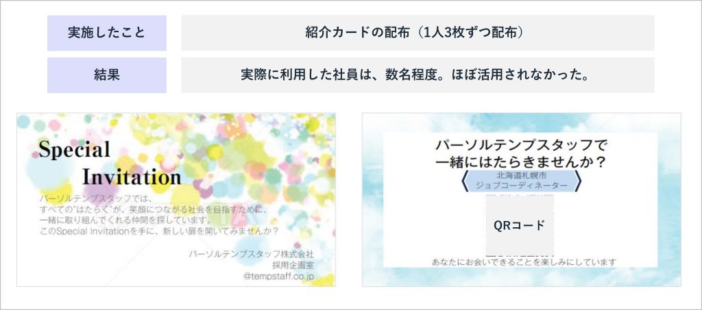 しかし、結果としてはカードからアクセスしてくださった方は数名で、実際の応募には繋がりませんでした。カードを作成してから、札幌の現地担当者へ配布依頼をし、対象社員へカードの配布を知らせるメールを送ったきりになっており、恐らく社員はどのように活用したらいいのかイメージが沸いていなかったと思います。