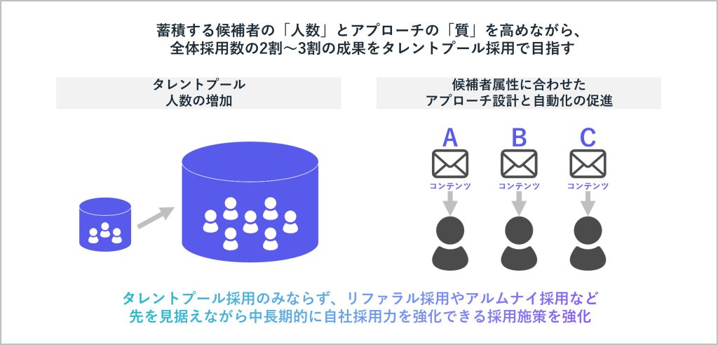 エージェントからの推薦や、新規応募が来るのを待たずに、”自社が保有する候補者リストに接点を取る”タレントプール採用の取り組みは、採用部門が抱える「母集団不足」「紹介依存」「定着率低下」といった悩みに対し、再現性のある打ち手となっています。
